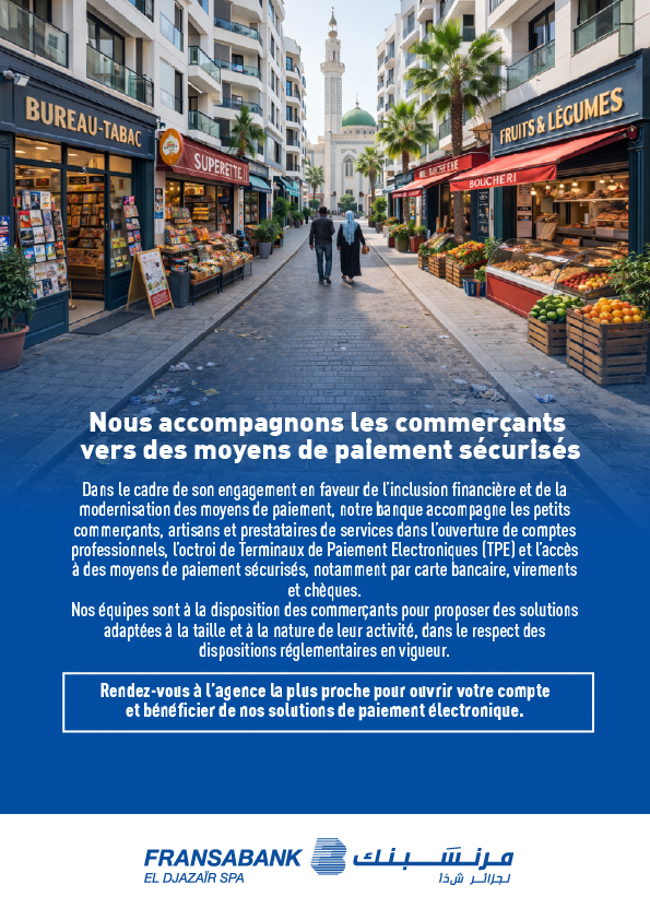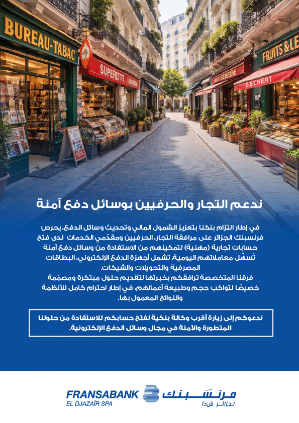 إقامة ” الصنوبر”، عمارة “أ”، القطعة رقم 994، القسم رقم 04، الشراقة – الجزائر. الهاتف: 200 999 021 (213+) الفاكس: 207 999 021 (213+) رمز السويفت FSBKDZAL البريد الإلكتروني info@fransabank.dz